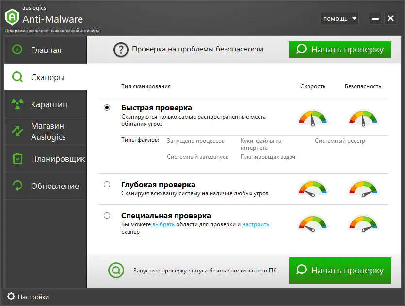- Три режима проверки: быстрое, глубокое и настраиваемое