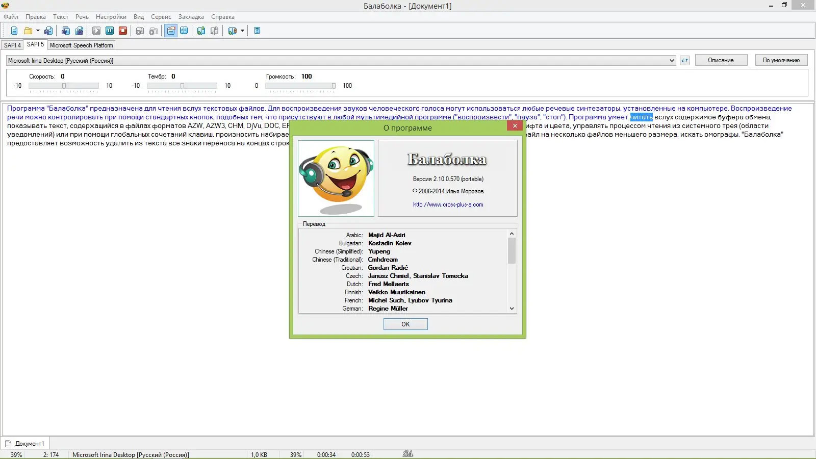 Для комфортной работы программы рекомендуется использовать современную систему Windows с установленными речевыми компонентами.