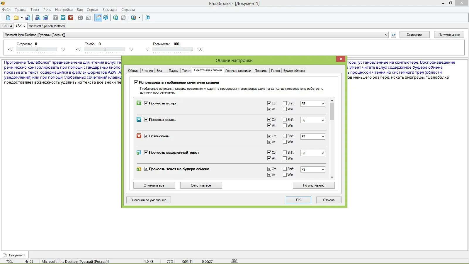 Программа «Балаболка» предназначена для чтения вслух текстовых файлов с использованием различных синтезаторов речи, включая голосовые нейросети. Она позволяет воспроизводить текст при помощи стандартных мультимедийных кнопок, а также управлять процессом чтения через системный трей или глобальные сочетания клавиш. Поддерживаются форматы файлов различных типов, что делает программу универсальным инструментом для озвучки и аудиовёрстки. Воспроизведение речи можно контролировать легко и интуитивно, а настройка голоса осуществляется через параметры скорости, тембра и выбор голосовых моделей.