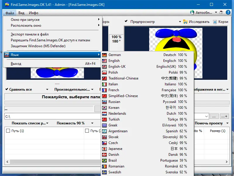 - При необходимости выбрать язык интерфейса и настроить параметры поиска.