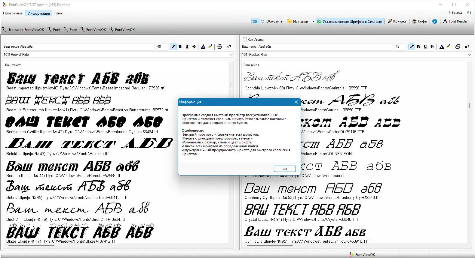 Перед вами крошечная программа, которая после запуска отобразит пользователю все установленные в его операционной системе шрифты, и конечно вы сможете с ними работать. Особенность программы, позволяющая вводить любой текст в специальное отведенное поле и сразу просматривать результат, то есть сразу будет видно, как набранное слово будет смотреться в том или ином стиле шрифта, я думаю удобная фишка покажется не только мне. Помимо этой возможности, FontViewOK позволит пользователям изменять не только цвет шрифта, но и редактировать его размер, стиль и прочие другие параметры.