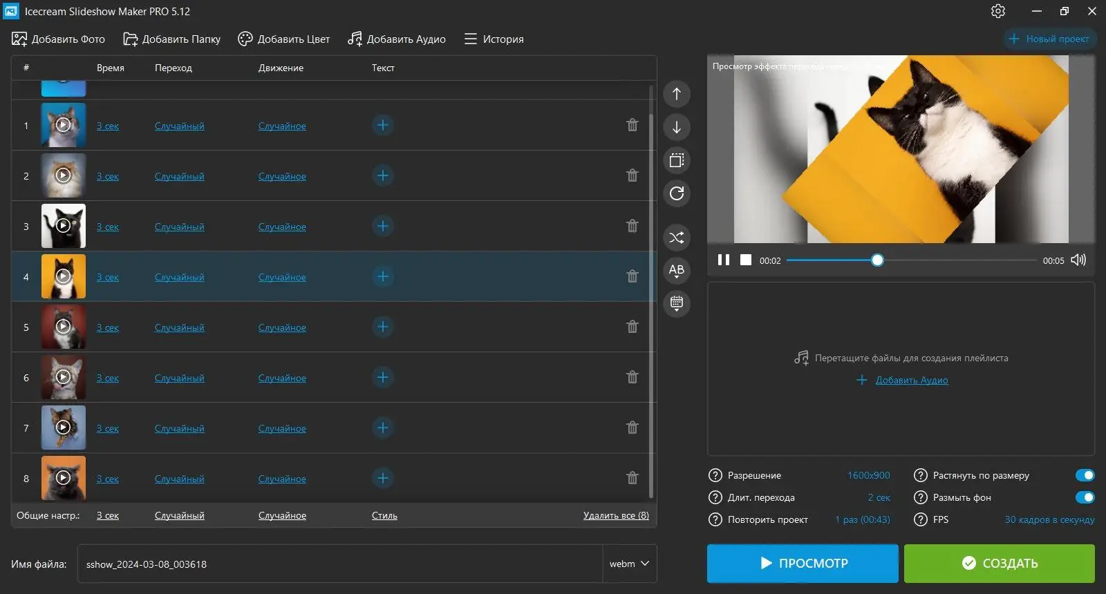 Icecream Slideshow Maker предоставляет возможность легко создавать качественные слайдшоу. Просто добавьте любимые фотографии, настройте время воспроизведения и эффекты перехода для каждого кадра, и просмотрите результат с помощью встроенного предпросмотра. Программа поддерживает создание проект в разрешении Full HD и загрузку итогового файла на платформы, такие как Youtube. Продвинутые функции позволяют добавить музыкальный фон и настроить его параметры, делая ваше видео по-настоящему уникальным.