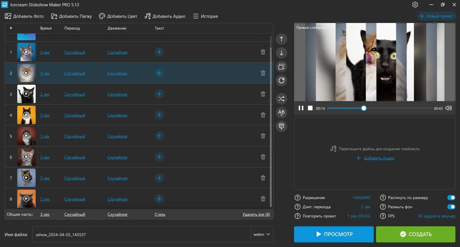 Это универсальное программное обеспечение разработано для быстрого и качественного создания слайдшоу. Вы можете добавить свои любимые фото, настроить время воспроизведения, выбрать эффект перехода и вставить музыку для более яркого оформления. Интуитивно понятный интерфейс позволяет завершить проект всего за несколько минут — достаточно добавить изображения, выставить нужные параметры, просмотреть предпросмотр и нажать кнопку «Создать». Программа поддерживает создание Full HD видео и загрузку готовых роликов на YouTube, что делает её удобным инструментом для деловых и личных проектов.