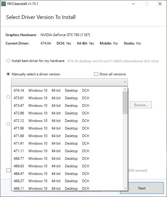 - Выберите компоненты драйвера и желаемую версию из списка.