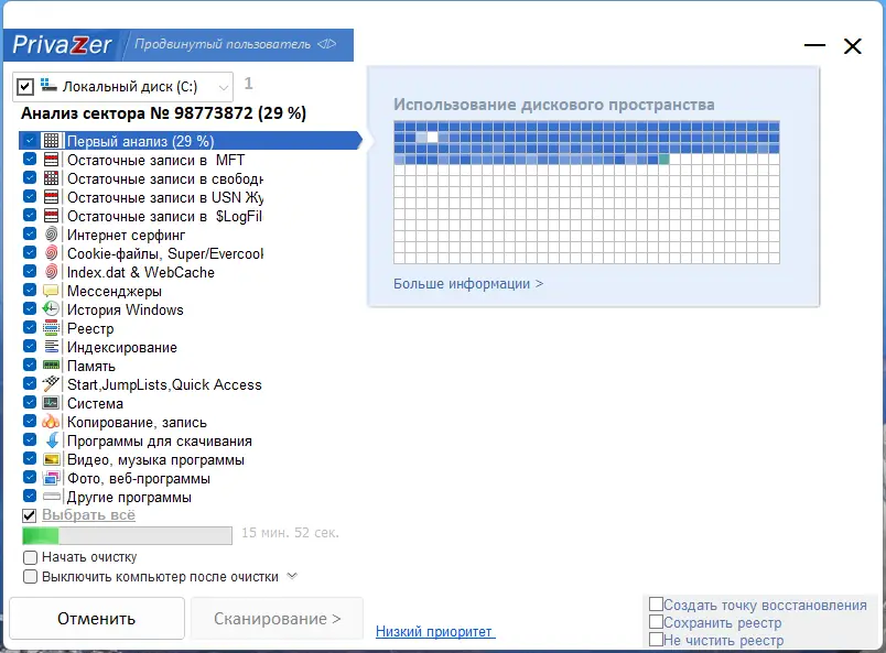 Программа PrivaZer поможет вам максимально безопасно и быстро очистить компьютер, удалив остаточные следы работы системы, истории посещений сайтов, cookies, файлы временных данных и другие личные сведения. Она подготовит детальный отчет обо всех обнаруженных следах в реестре, таблицах MFT и FAT, а также предоставит инструменты для их безвозвратного удаления с помощью современных алгоритмов. Особенность утилиты — поддержка съемных устройств и USB-ключей, возможность создания резервных копий изменений и интуитивно понятный интерфейс. Работает быстро и эффективно, обеспечивая высокий уровень защиты вашей конфиденциальности.