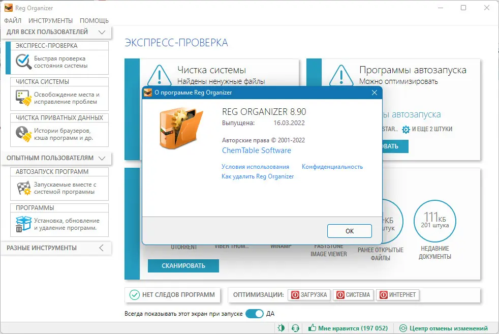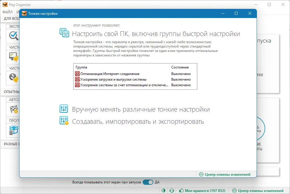 Программа обладает возможностью настроек под индивидуальные задачи пользователя, автоматической очистки ненужных обновлений и временных файлов, а также глубокой интеграцией с системным реестром через удобный интерфейс. Для более комфортной работы Reg Organizer предоставляет инструменты для экспорта и импорта настроек, создания рег-файлов, а также слежения за изменениями реестра во время работы программ.