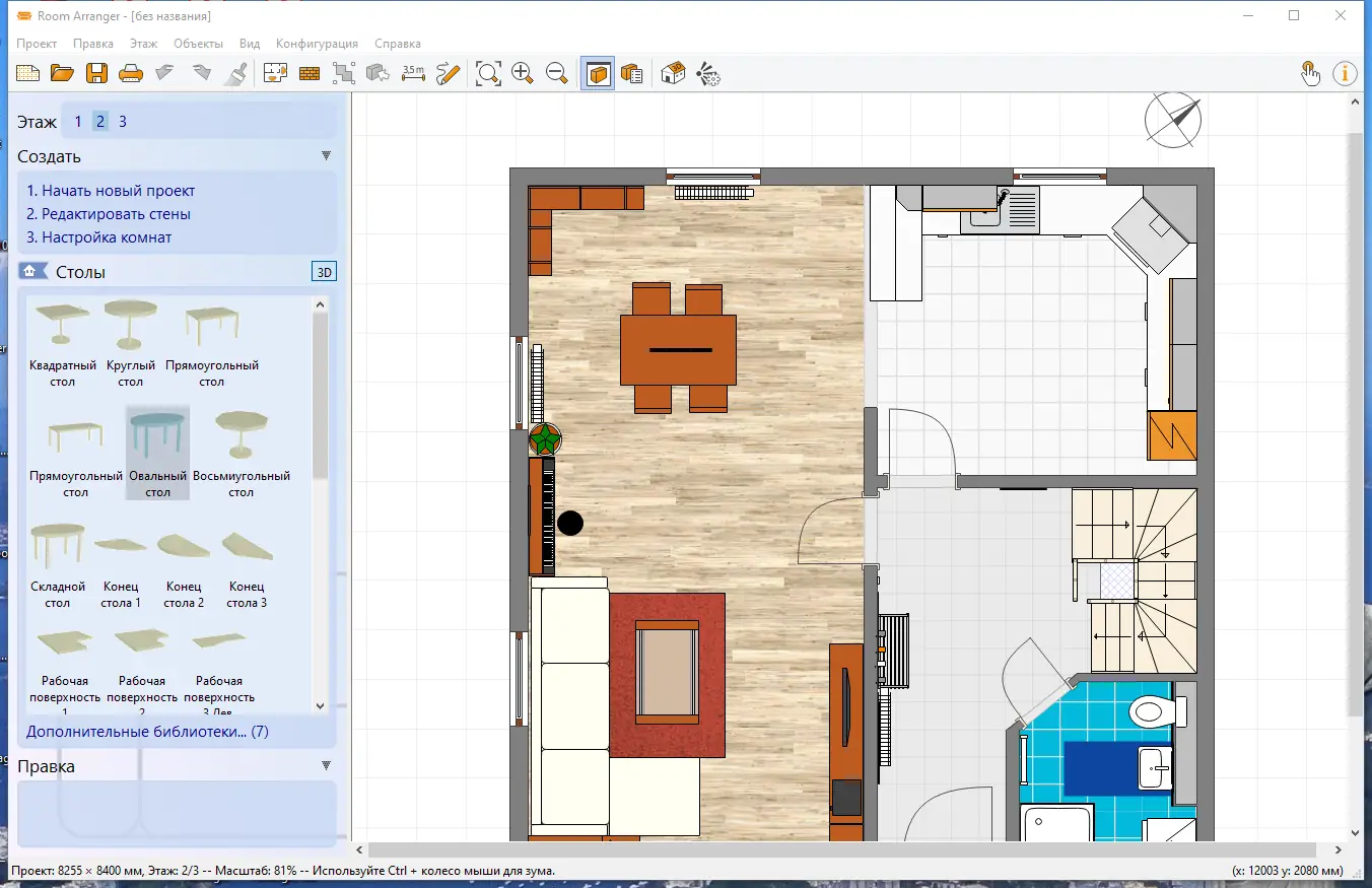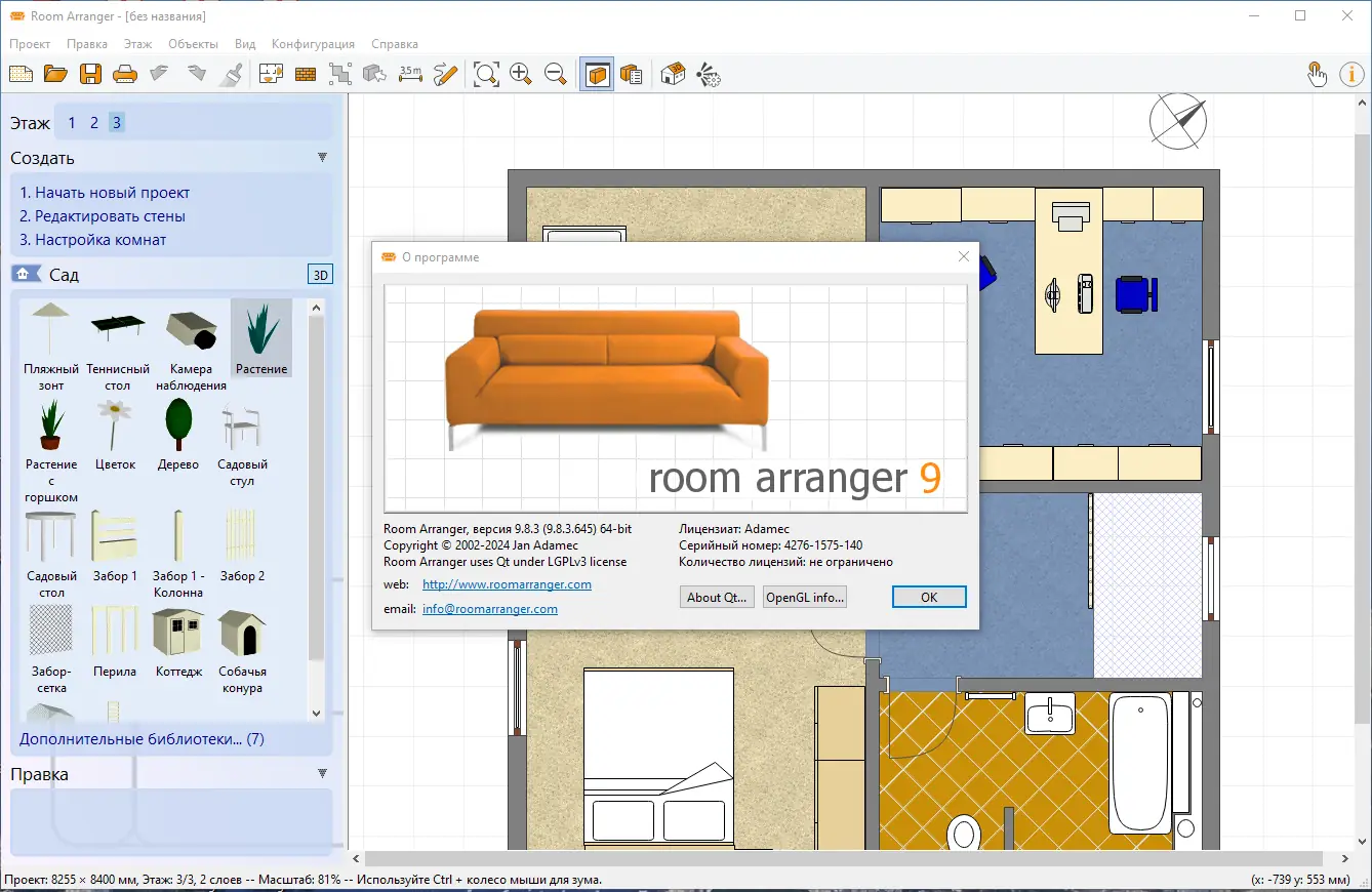 Room Arranger — это утилита, предназначенная для разработки, анализа и создания интерьерных решений. Она станет незаменимым помощником при переносе стен, перепланировке или перестановке мебели. Программа позволяет визуально наглядно передвигать, вращать, менять размеры и цвета объектов, а также создавать собственные модели предметов интерьера, которых еще нет в стандартных библиотеках. После работы можно просмотреть результат в 3D режиме и подготовить проект к публикации или печати.