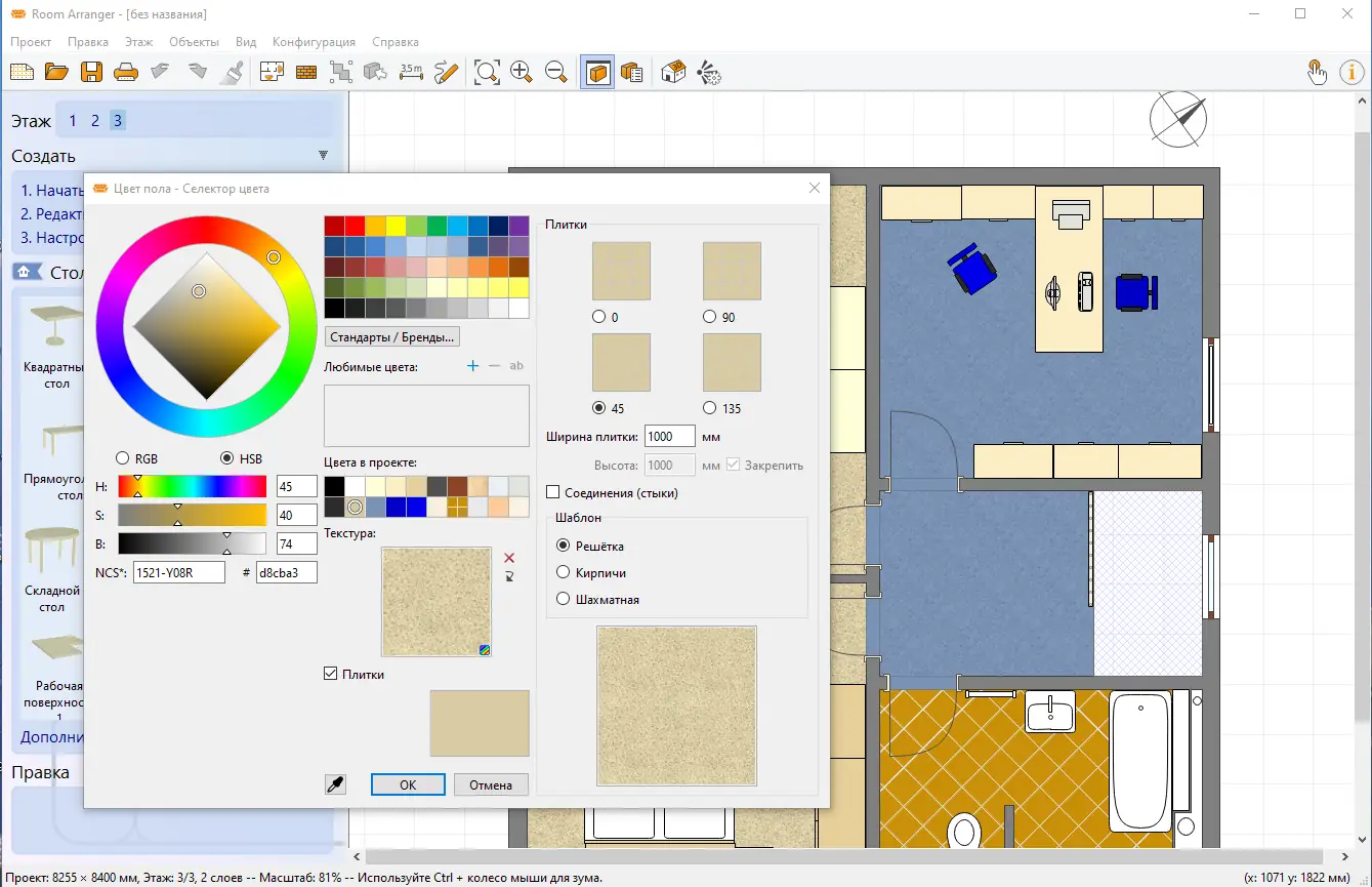 - Создание и редактирование интерьеров с возможностью изменения размеров, цвета и расположения объектов
