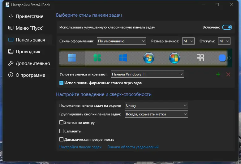 - Настраиваемое отображение меню «Пуск»: скины, изображение кнопки, активные углы экрана и другие параметры