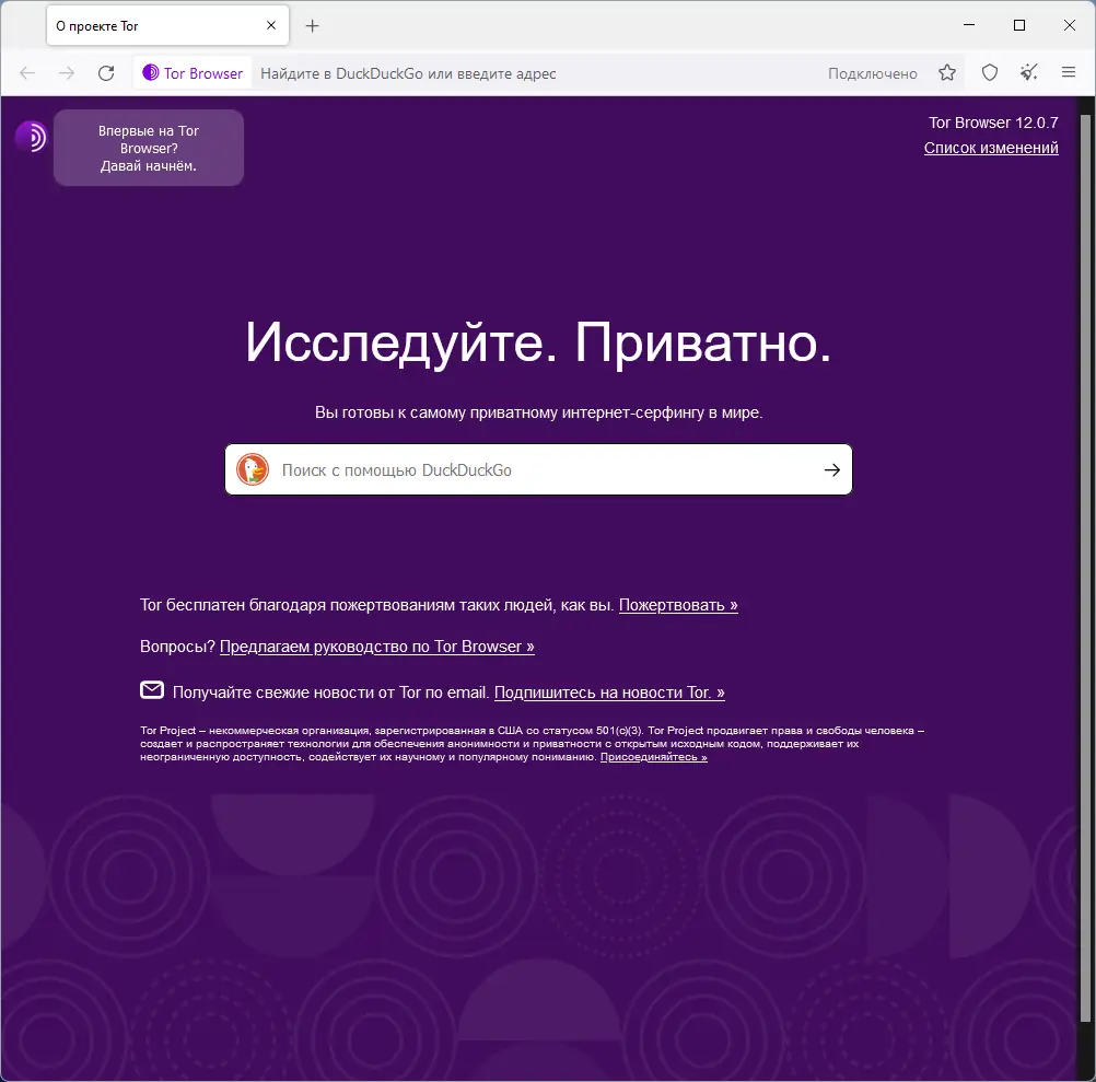 - После запуска убедиться, что в нижней части окна отображается статус «Tor включен».
