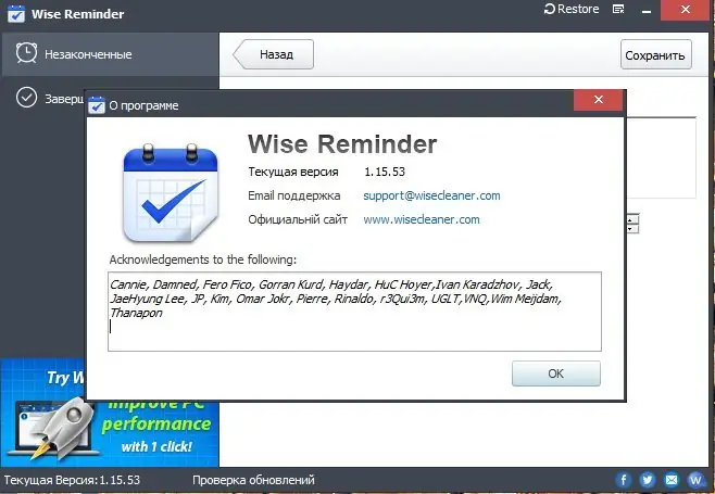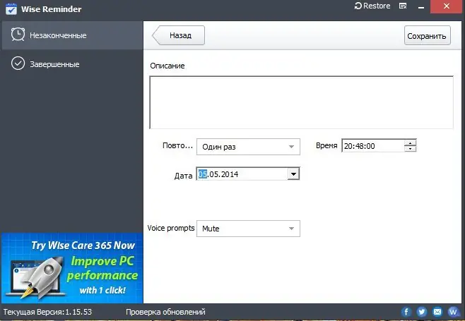 Wise Reminder — это простая и эффективная утилита для организации вашего дневного графика. Она позволяет создавать напоминания с описаниями, указывать время и дату, а также задавать повторяющиеся напоминания по различным периодам. Всё активные уведомления отображаются в основном окне системы, а при наступлении события всплывающее окно напоминает о необходимости выполнить задачу. Достаточно легкая в освоении, программа подходит для пользователей с любым уровнем навыков работы с программным обеспечением. В актуальной версии 1.15.53 добавлены голосовые подсказки, автоматический выбор языка и улучшена установка, что делает использование еще более комфортным.