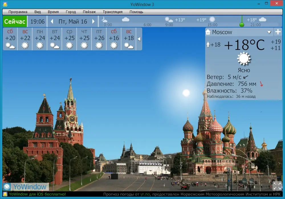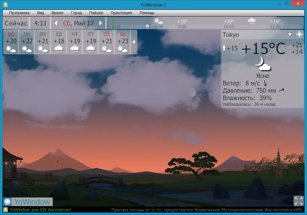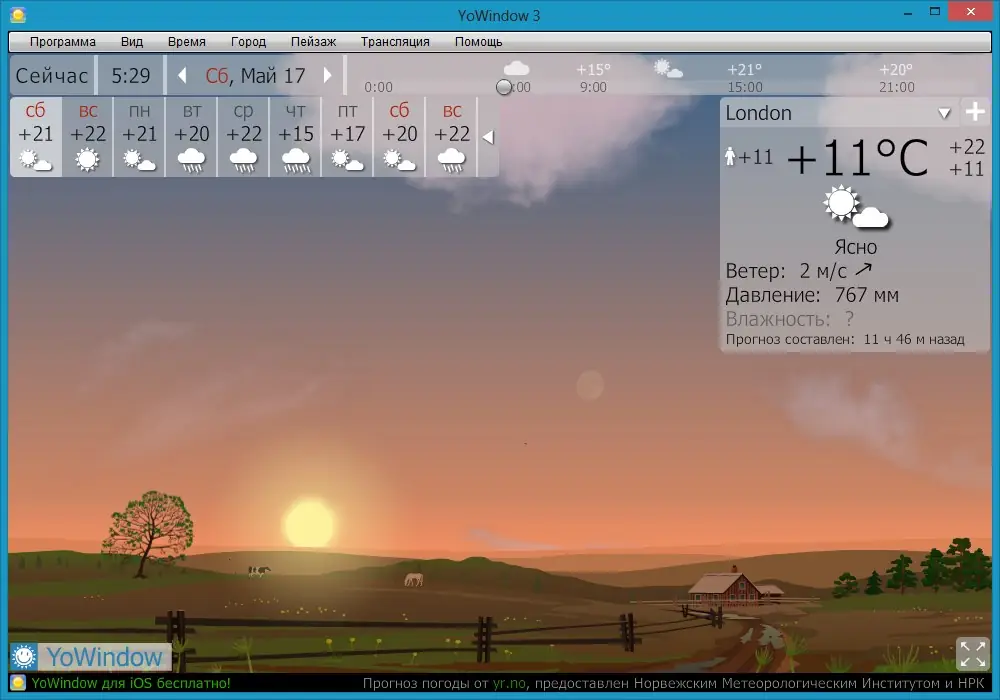 YoWindow — это уникальный монитор погоды, который отображает не только актуальные показатели, но и визуальную картинку окружающей среды, изменяющуюся в зависимости от погодных условий, времени суток и сезона. Благодаря возможности перемотки времени вперед, пользователи могут заранее увидеть прогноз погоды в любой нужный момент. Интерфейс программы напоминает окно в природу, создавая ощущение присутствия на свежем воздухе. В дополнение к погодным явлениям, такими как дождь, снег, ветер и туман, отображаются солнце, луна и звезды, что делает отображение максимально реалистичным.