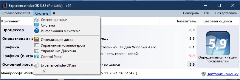ExperienceIndexOK — небольшая портативная утилита от разработчиков Nenad Hrg, которая позволяет быстро просмотреть индекс производительности компьютера без необходимости установки. Особенно полезна для пользователей Windows 8.1 и 10, где стандартные средства не предоставляют возможность увидеть полную оценку производительности в привычном виде.