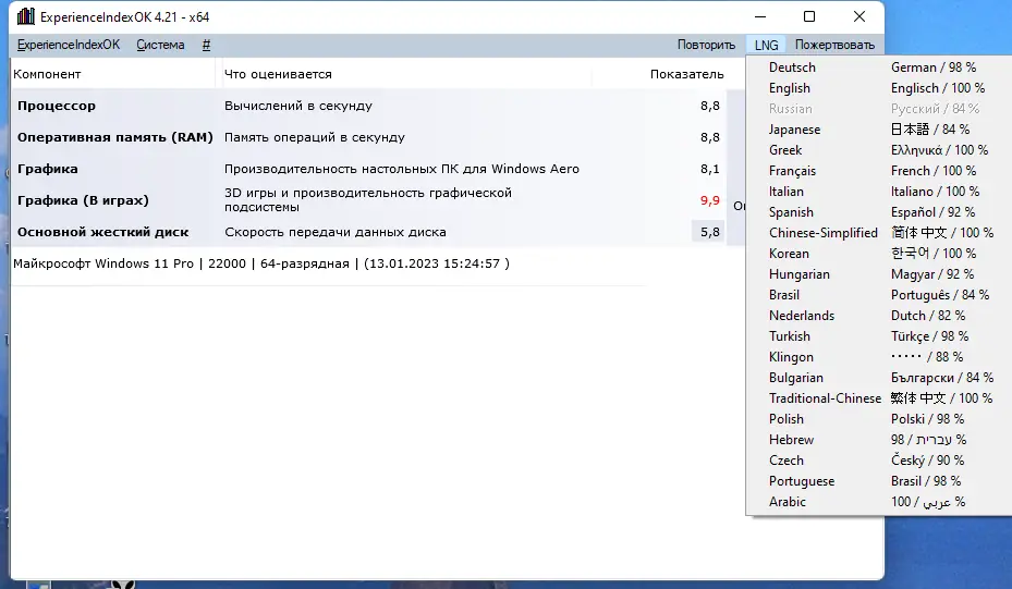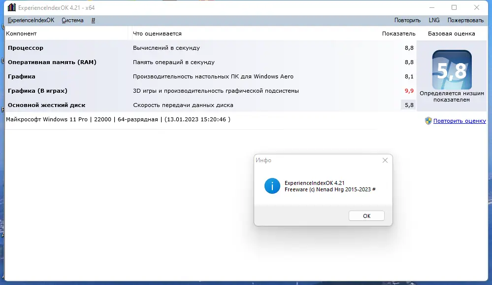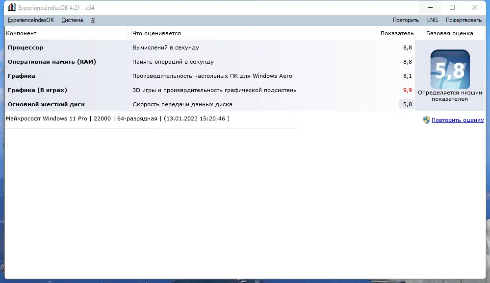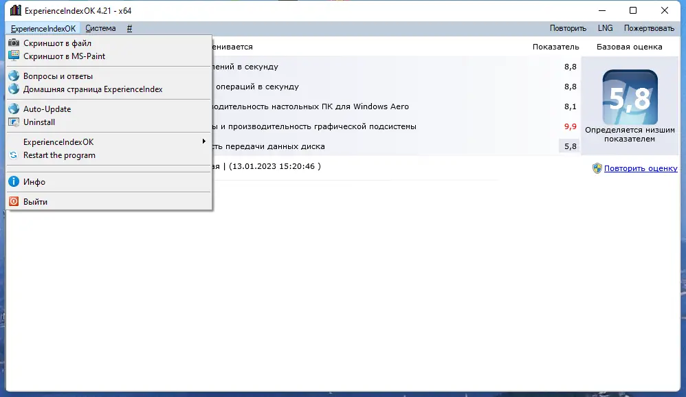 ExperienceIndexOK — небольшая портативная утилита, разработанная Nenad Hrg, предназначенная для оценки производительности компьютера без необходимости установки. Особенно полезна для пользователей Windows 8.1/10/11, так как стандартные средства в этих системах не предоставляют полноценного отображения индекса в привычном виде.