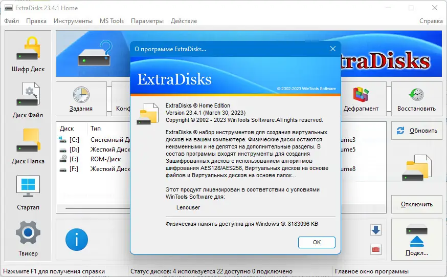 ExtraDisks — это мощный набор инструментов для создания виртуальных дисков на физических носителях компьютера, предусматривающий шифрование, быстрый доступ к папкам и управление автозагрузкой. Программа обеспечивает безопасность и удобство работы с данными, не требуя разбивки жесткого диска на дополнительные разделы.