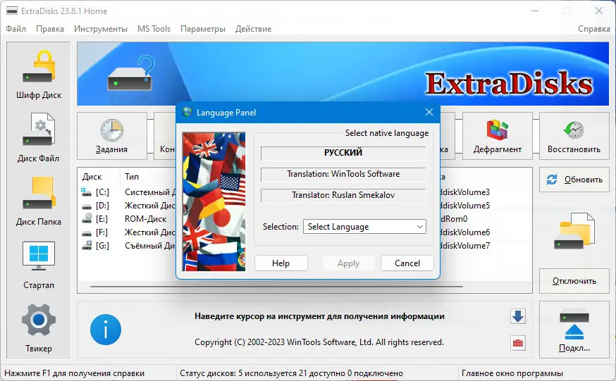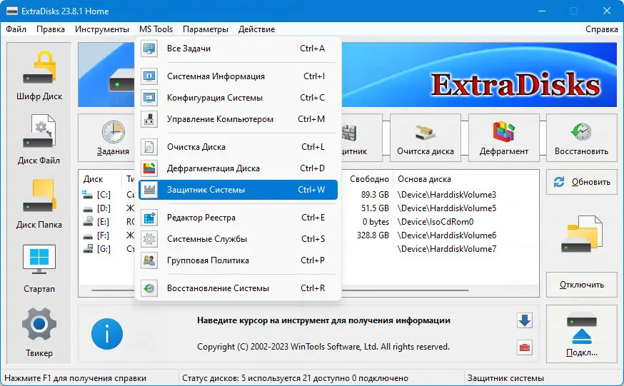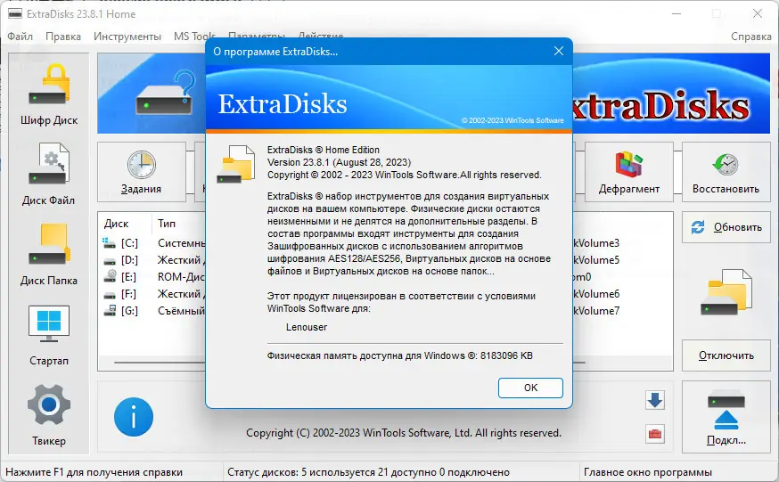ExtraDisks — мощный набор инструментов, предназначенных для создания виртуальных дисков на физических носителях вашего компьютера. Этот софт позволяет создавать защищённые зашифрованные диски, виртуальные диски на основе файлов и каталогов, без необходимости деления основного диска на дополнительные разделы. В текущей версии реализованы функции для настройки системной безопасности, ускорения работы и автоматизации процессов загрузки. Программа совместима с системами Windows 7, 8/8.1, 10 и 11 как в x32, так и в x64 Bit версиях, а также бесплатно и через торрент для личного использования.