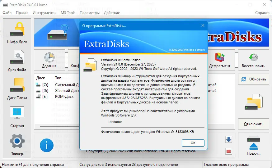 ExtraDisks — это мощный набор инструментов, предназначенных для создания и управления виртуальными дисками на физических носителях вашего компьютера. Программа обеспечивает создание виртуальных, зашифрованных и дисков с папками без изменения текущей структуры дисков, что позволяет повысить безопасность данных и упростить быстрый доступ к часто используемым папкам. Современная версия включает такие инструменты, как создание зашифрованных дисков с алгоритмами AES128 и AES256, виртуальных дисков на основе файлов или каталогов, а также диспетчер автозагрузки и настройка системы для повышения уровня безопасности и производительности.
