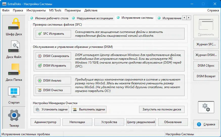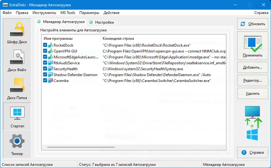 - Инструменты для управления автозагрузкой: добавление, удаление и исключение программ из автозапуска, а также отключение сторонних виртуальных дисков.