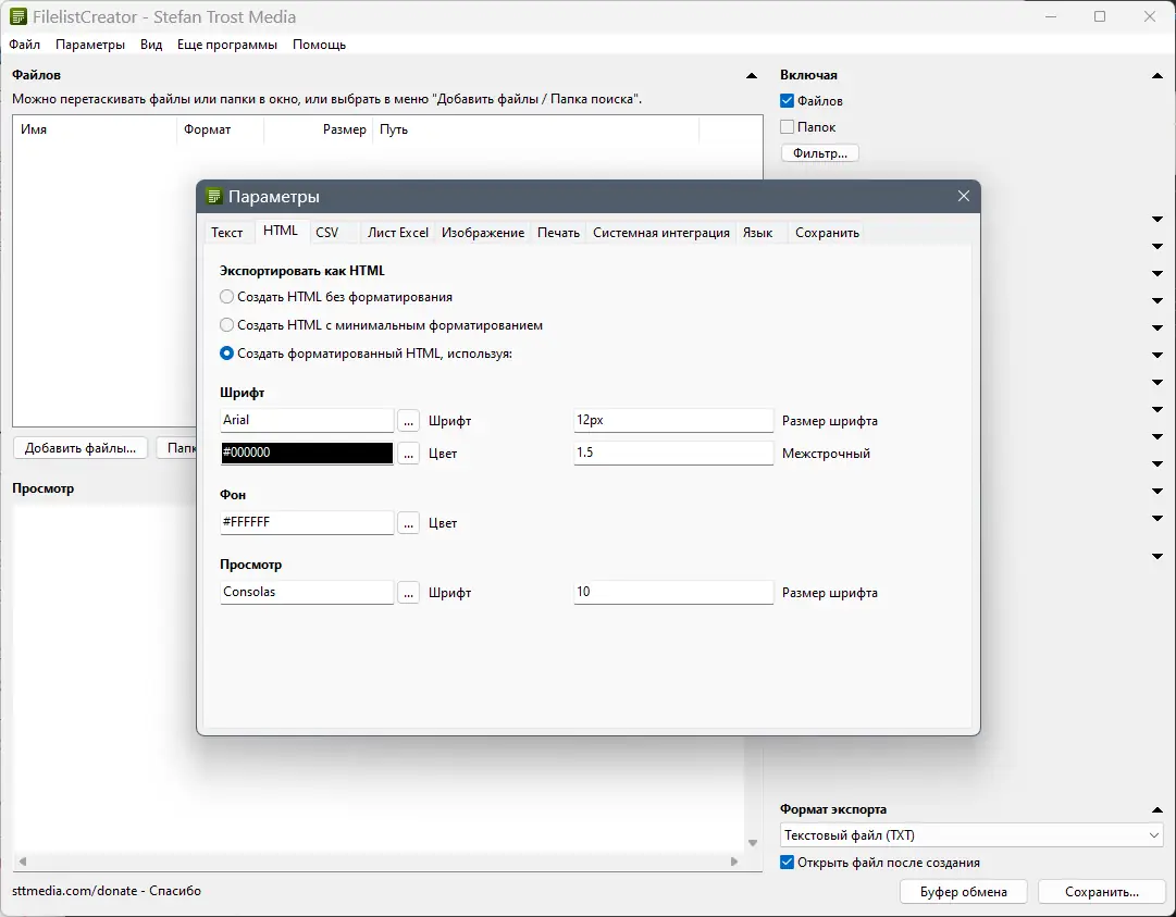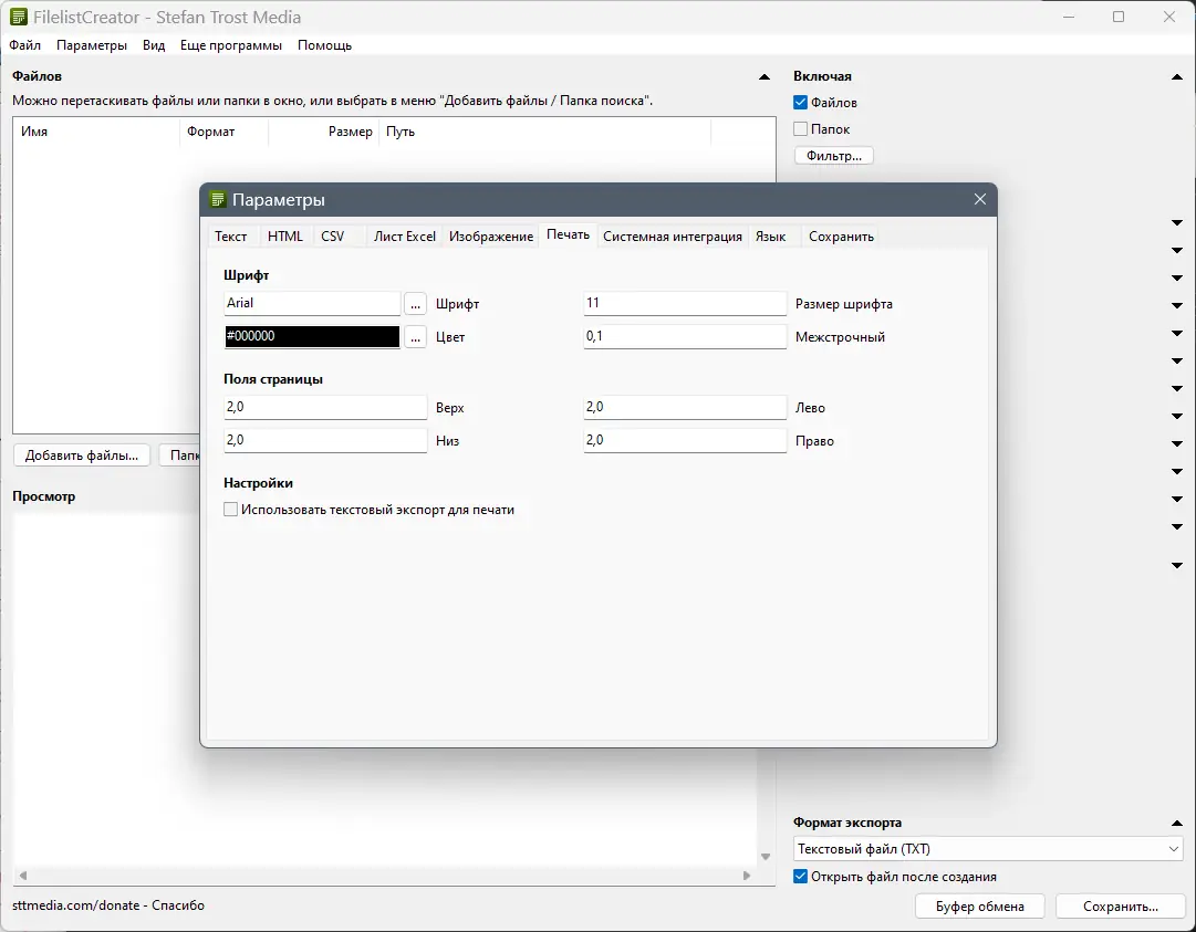 - Настройте параметры экспорта и начните создание списков файлов.
