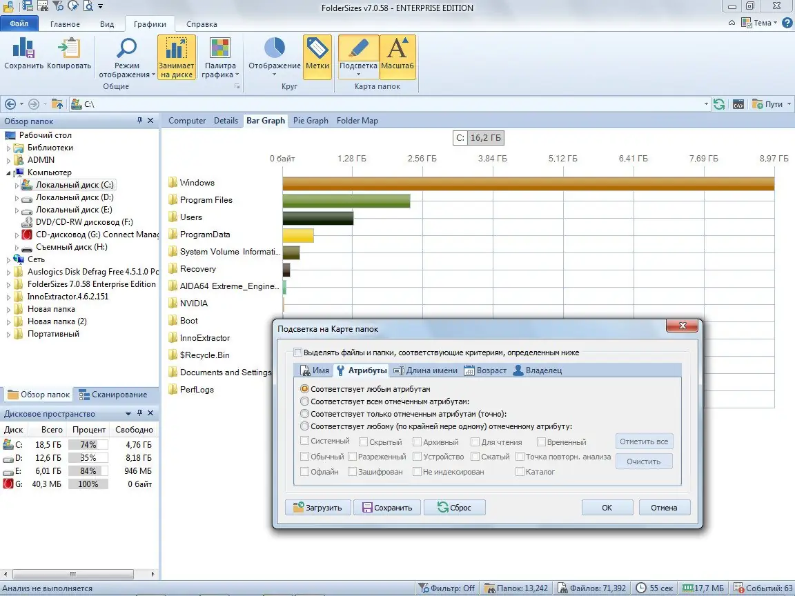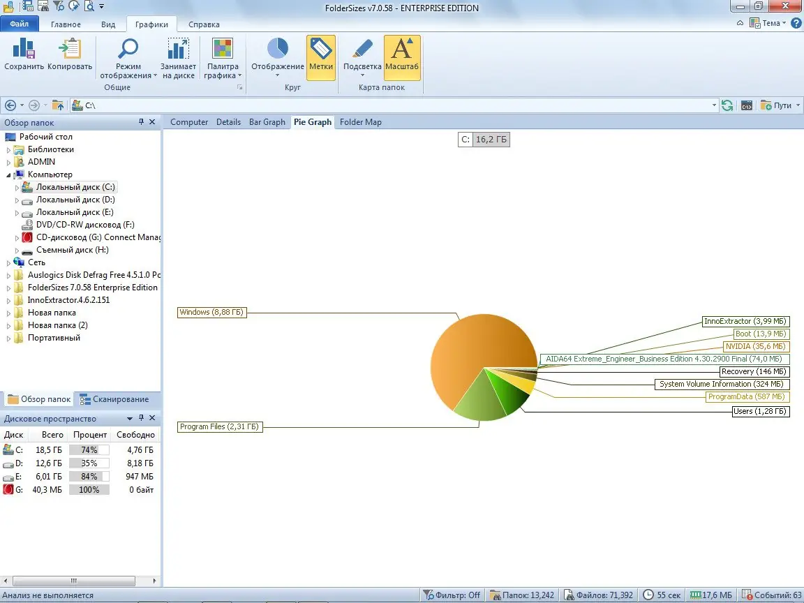 FolderSizes — это инструмент, предназначенный для подробного анализа использования дискового пространства на вашем компьютере. Благодаря иерархической системе отображения данных на базе технологии TreeMap, программа позволяет наглядно определить, почему остается так мало свободного места. Встроенные функции включают создание отчетов, которые можно распечатать или экспортировать в HTML, а также сохранение диаграмм в файлы форматов JPEG, PNG, BMP и TIFF. Также реализована система анализа по типам файлов, что дополнительно облегчает работу с крупными объемами данных и помогает выявить «тяжелые» папки и файлы.
