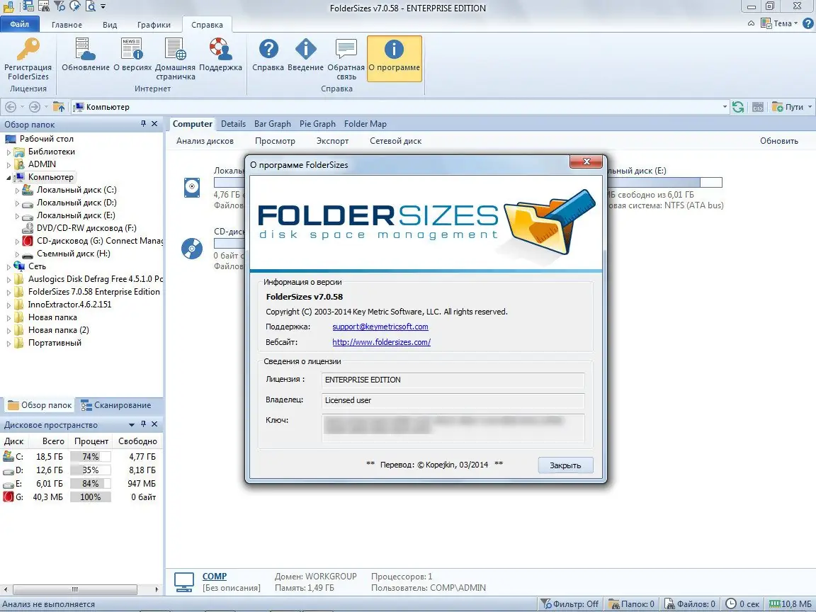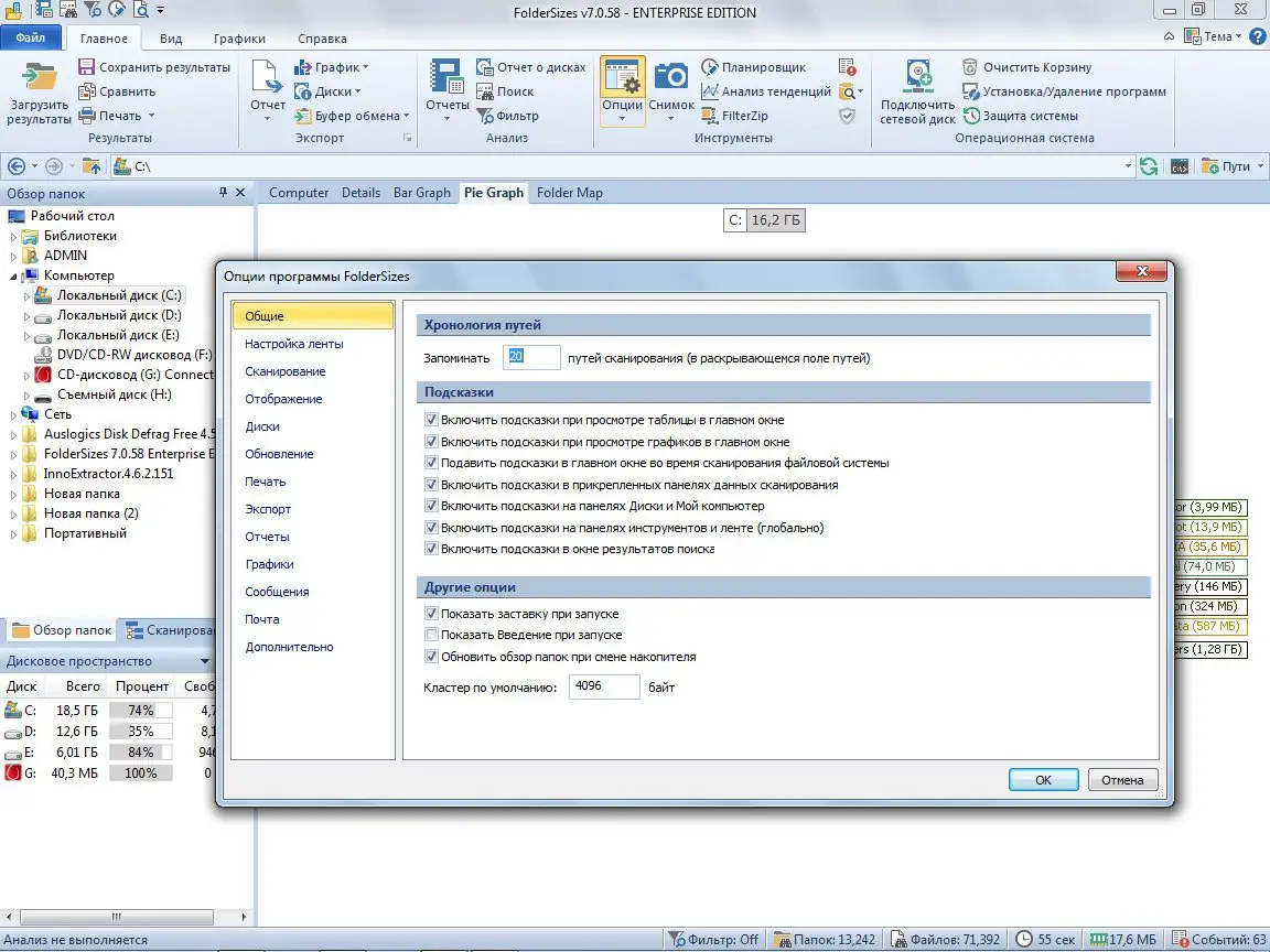 - Просмотр общего и свободного пространства для стационарных, съемных и сетевых дисков