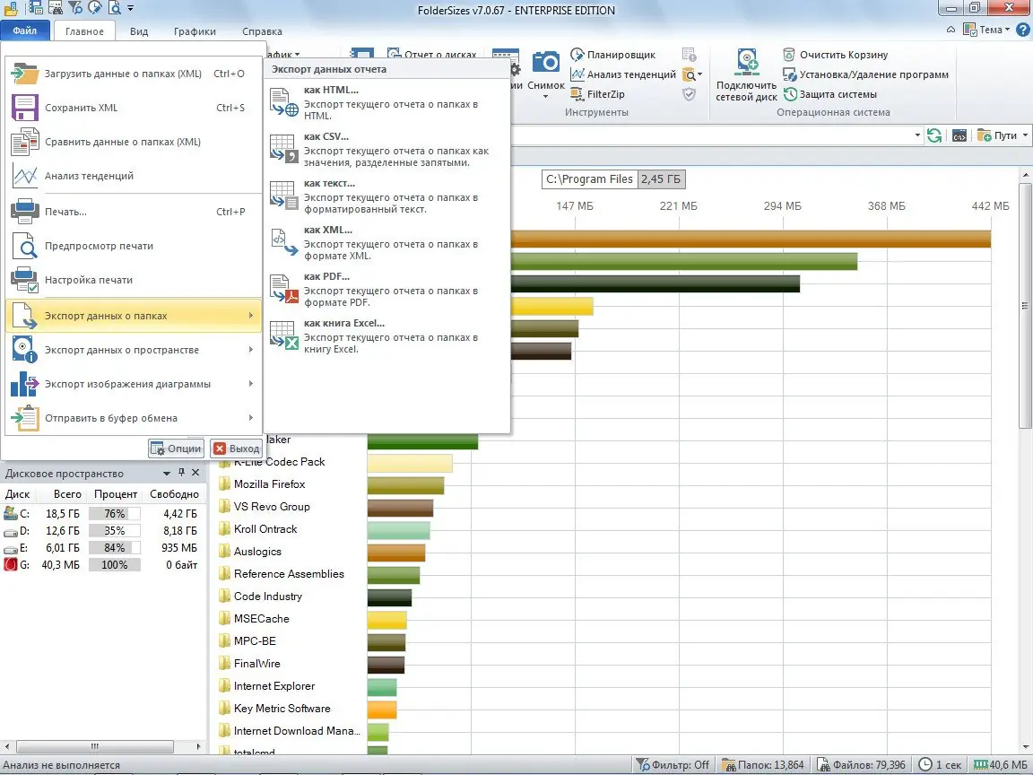 - Глубокий анализ дискового пространства с созданием подробных отчётов и диаграмм.