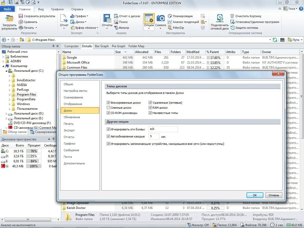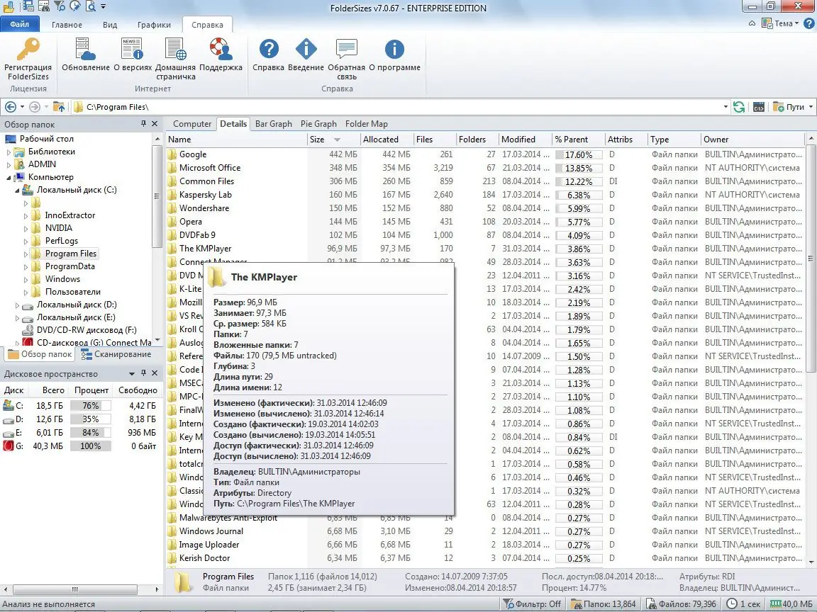 FolderSizes — универсальная программа для анализа и контроля использования дискового пространства на жестких дисках. Ее ключевая задача — выявить, почему на диске осталось так мало свободного места и помочь в оптимизации хранения данных. Благодаря детальным отчетам и наглядным диаграммам, вы легко обнаружите самые объемные папки и файлы.