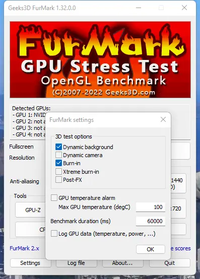 - Проведение стресс-тестирования видеокарт с настройкой разрешения, режима и времени испытания