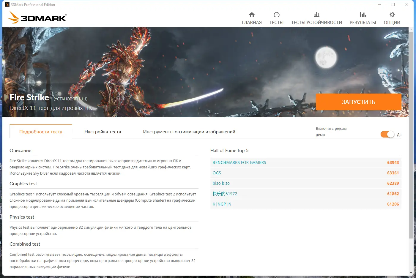 Futuremark — это мощная программа для тестирования производительности вашей системы в различных игровых и графических сценариях. Позволяет определить возможности оборудования и сравнить их с актуальными стандартами, обеспечивая подробную аналитику и мониторинг.