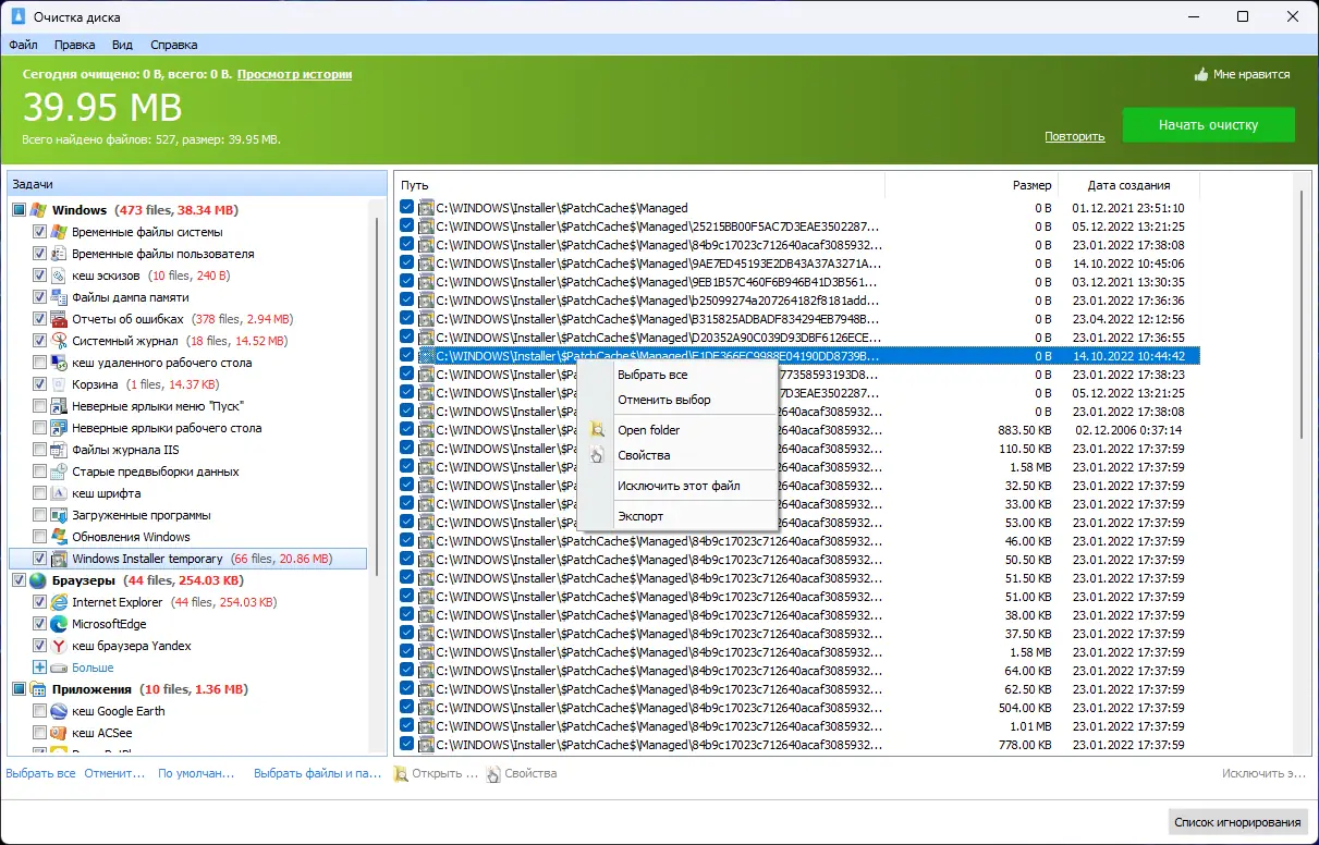- Очистка временных файлов системы и программ