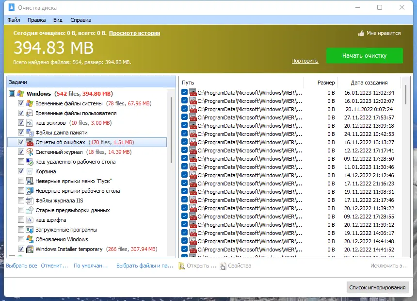 - Удаление файлов дампа памяти и отчетов об ошибках