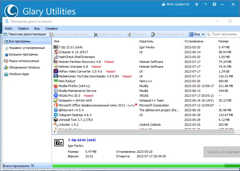 Данный софт представляет собой многофункциональный набор системных твикеров и утилит, разработанных для оптимизации работы Windows. С помощью его можно легко избавиться от устаревших регистрационных записей, истории интернет-активности и ненужных файлов, а также повысить безопасность системы за счет удаления следов работы. Благодаря широкому набору плагинов и высокой совместимости с более чем 45 программами, Glary Utilities позволяет оптимизировать использование системной памяти, искать и исправлять неработающие ярлыки, управлять автозагрузкой и удалять нежелательные программы. Всё это обеспечивает более быструю и стабильную работу компьютера.