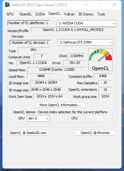 - Просмотр основных параметров и версий OpenGL, OpenCL и CUDA.