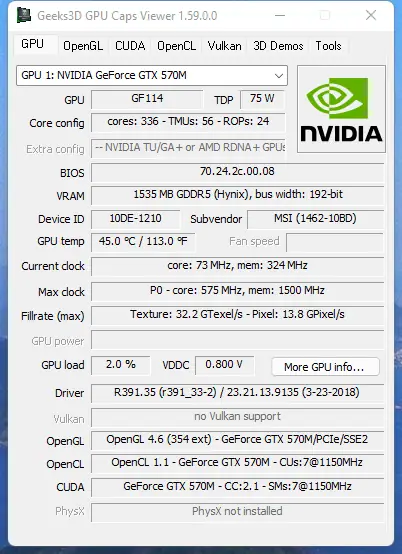 - Полная информация о драйверах, OpenGL, OpenCL и CUDA.