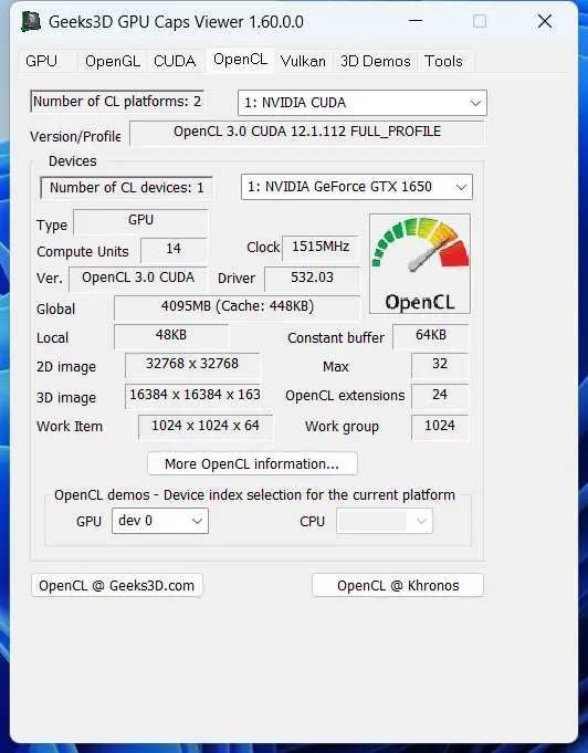 - Просмотр основных параметров OpenGL, таких как версия, размер текстур и количество текстурных модулей.