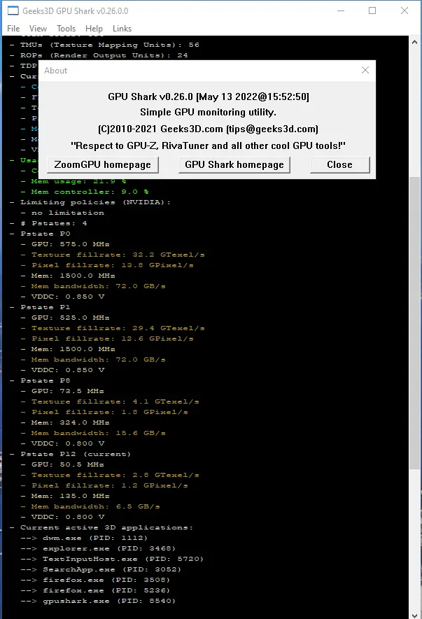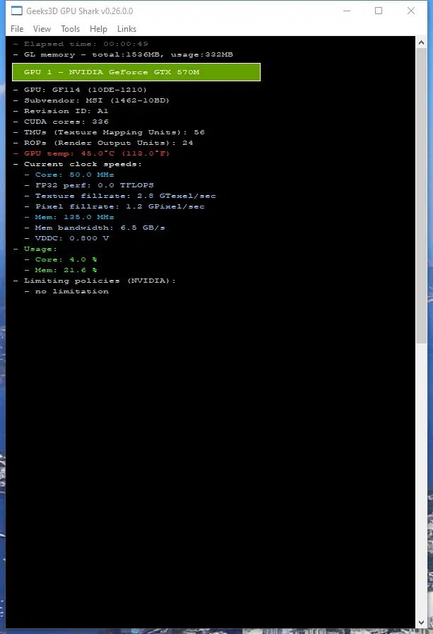 GPU Shark — это универсальный инструмент для мониторинга ПК, который не загроможден лишним функционалом и без труда интегрируется в рабочие процессы. Он отлично подходит для быстрого получения информации о состоянии видеокарты, что делает его ценным для диагностики и оценки производительности системы.