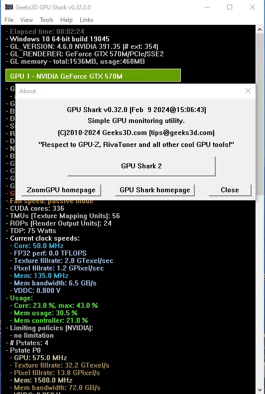 GPU Shark создана как легкое решение для отслеживания производительности и состояния видеокарт. Она основана на движке ZoomGPU и совместима с компьютерными системами на базе Windows 7, 8/8.1, 10 и 11 как в 32-лопатной, так и в 64-битной версиях. Основная задача — отображение тактовых частот, температуры, скорости вентилятора и степени загрузки GPU и памяти. В программе реализованы два режима отображения: упрощенный, показывающий только основные параметры, и подробный — с расширенной информацией. Есть отдельное окно для мониторинга памяти, что удобно при работе с тяжелыми графическими приложениями или во время тестирования системы.