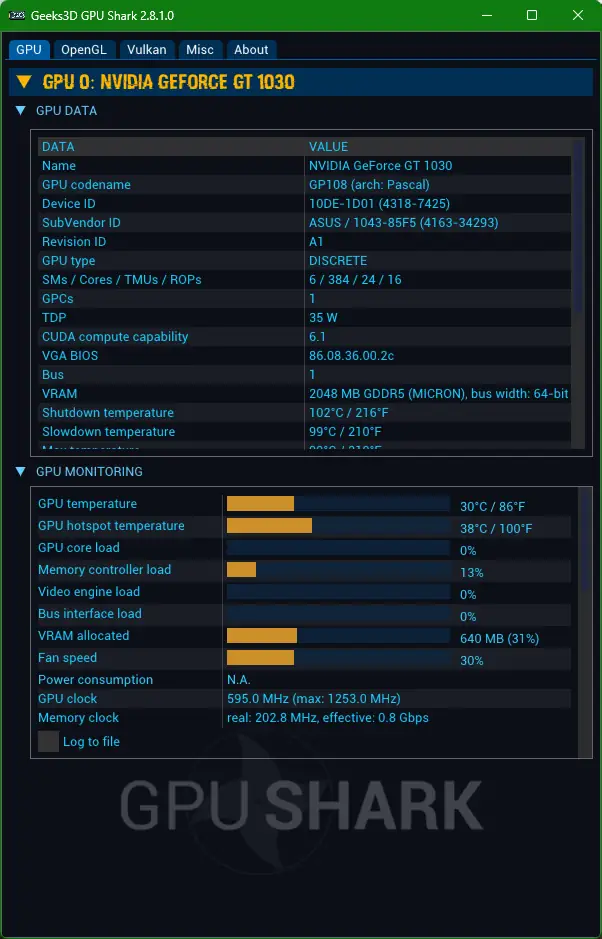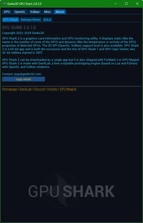 GPU Shark — это современная информационно-мониторинговая утилита для видеокарт, позволяющая отслеживать ключевые параметры работы графического процессора. Она является преемником первой версии и отличается расширенным функционалом и удобством использования. Программа позволяет в реальном времени контролировать температуру, использование ресурсов, тактовую частоту и уровень потребляемой мощности как графического процессора, так и VRAM. Кроме того, GPU Shark предоставляет информацию о поддержке API OpenGL и Vulkan, что делает её незаменимым инструментом для специалистов и энтузиастов, желающих получать точные данные о состоянии видеокарты.