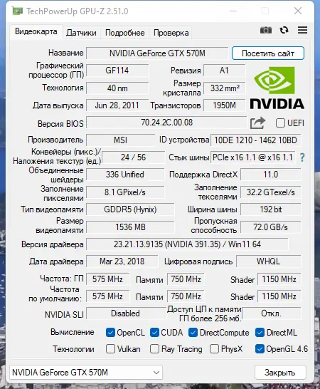 - Отображение полной информации о видеокарте и графическом процессоре.