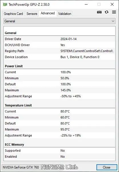 - Отображение данных о размере видеопамяти, разрядности шины, версии драйвера.