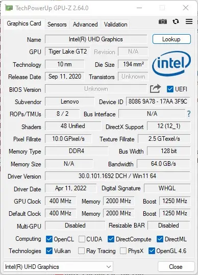 GPU-Z — это мощный и удобный инструмент, предназначенный для отображения основых характеристик графического процессора (GPU) и его видеопамяти. Работая под ОС Windows 7, 8/8.1, 10 и 11 (x32/x64 бит), программа позволяет пользователю получить детальную информацию о производителе, модели, размерах и типе видеопамяти, а также дату и версию видеобиос и драйверов. Помимо этого, она показывает поддерживаемые видеотехнологии и стандарты, а также осуществляет мониторинг температуры, частоты ядра и видеопамяти, скорости вентилятора и других датчиков в реальном времени.