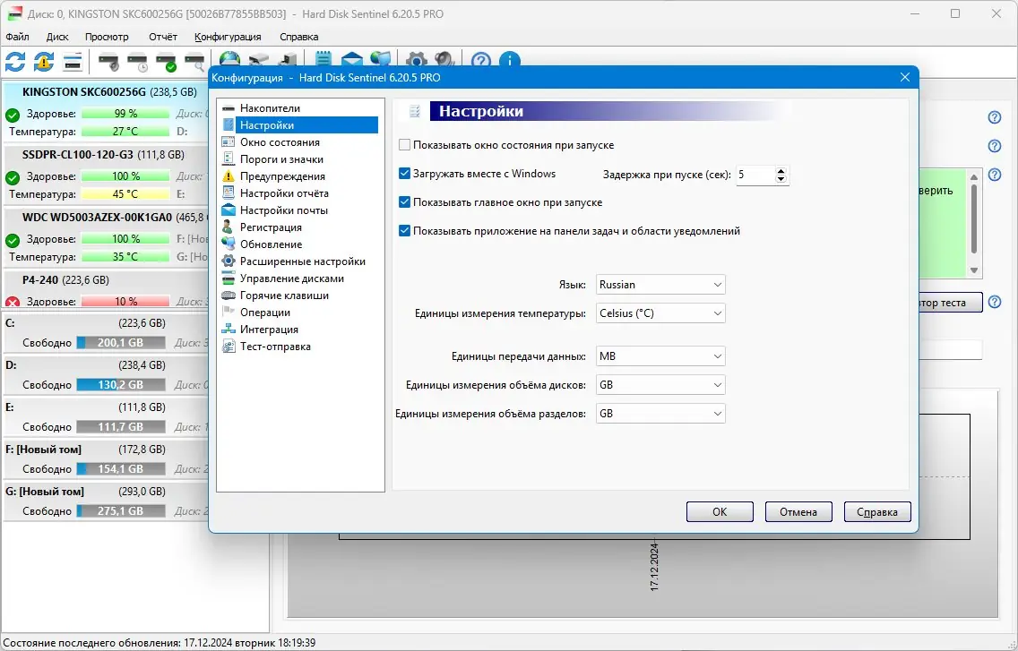 - Показ температуры дисков и автоматические предупреждения при превышении пороговых значений.