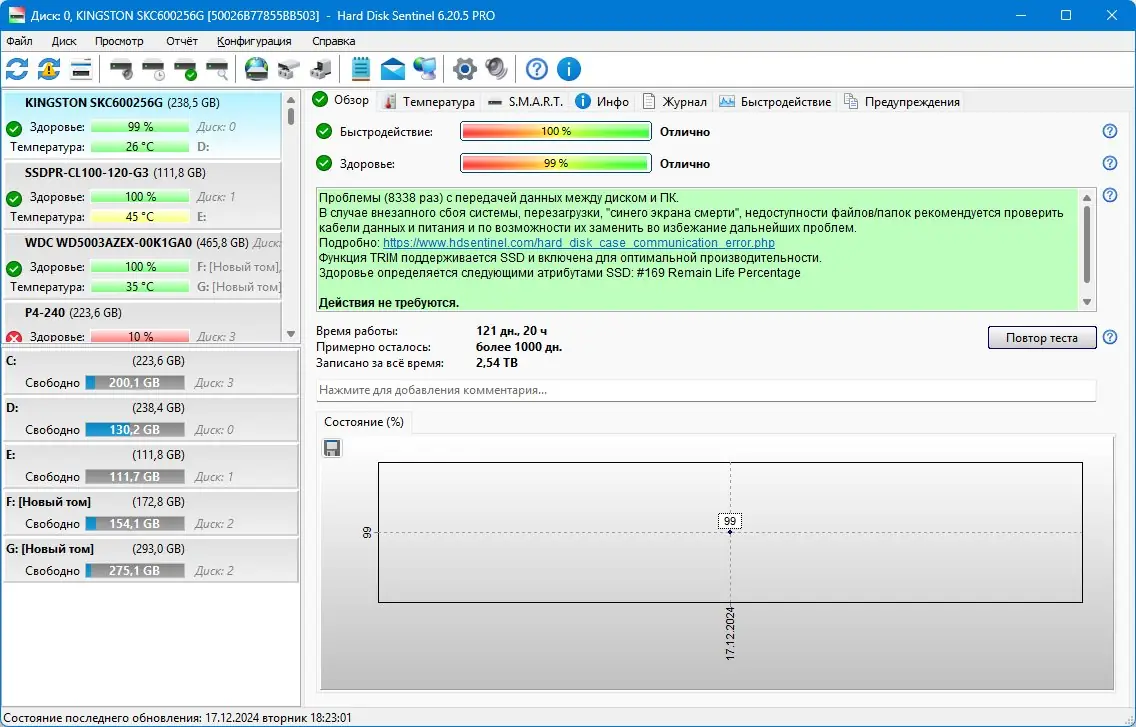 Hard Disk Sentinel — универсальная программа для мониторинга состояния HDD и SSD носителей. Обеспечивает постоянный контроль здоровья дисков, предупреждает о возможных сбоях и помогает избежать потери ценных данных.