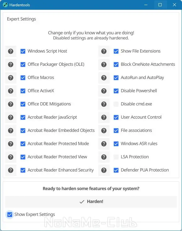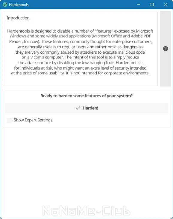 Hardentools — это простое в использовании бесплатное решение, которое позволяет пользователю отключить определенные функции Windows и приложений, снижая риски безопасности. Основная идея заключается в том, чтобы минимизировать площадь для возможных атак, отключая те компоненты, которые не требуются для повседневной работы. Запуск программы занимает всего несколько секунд: достаточно запустить исполняемый файл и нажать кнопку «Harden». В результате выбранные функции системы будут отключены одним щелчком мыши, а при необходимости их можно легко восстановить через встроенную функцию. Однако важно помнить о необходимости осознанного подхода и предварительной консультации с экспертом через функцию «Show Expert Settings», чтобы не отключить нужные компоненты. Программа универсальна и совместима с системами Windows 7, 8/8.1, 10 и 11, а также поддерживает версии x32 и x64 Bit.