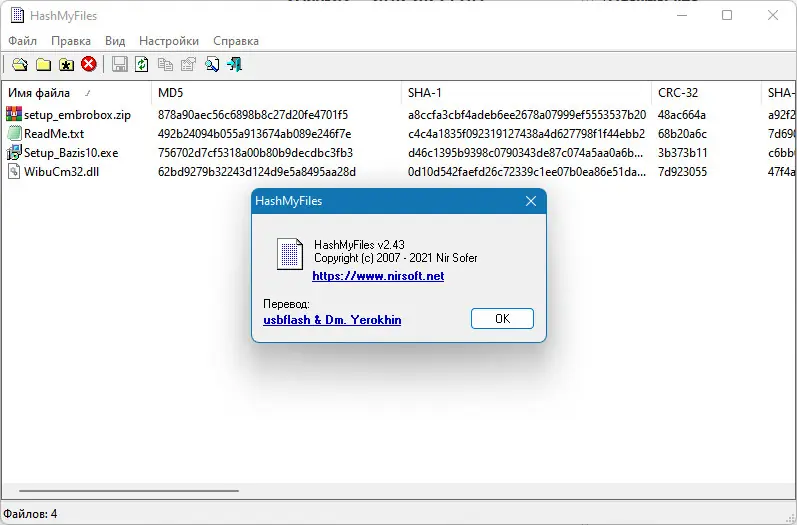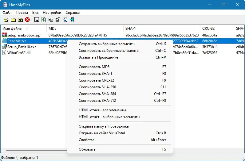 HashMyFiles — это легкая и удобная программа, предназначенная для сверки контрольных сумм файлов. Она позволяет быстро и точно проверить целостность как отдельного файла, так и группы файлов, используя наиболее популярные алгоритмы, такие как MD5, SHA1 и CRC32. Вся работа осуществляется без необходимости сложных настроек, интерфейс интуитивно понятен, а программа легко запускается из контекстного меню проводника, что значительно ускоряет процесс сравнения. Поддерживаются экспорт результатов в различные форматы, а также копирование хэшей в буфер обмена.