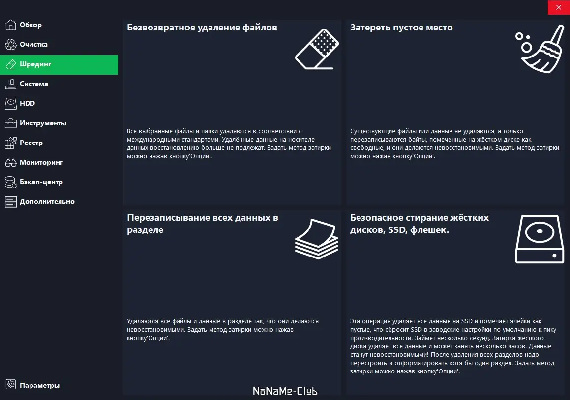 - Затирание удаленных файлов и очистка временных данных при помощи передовых алгоритмов.