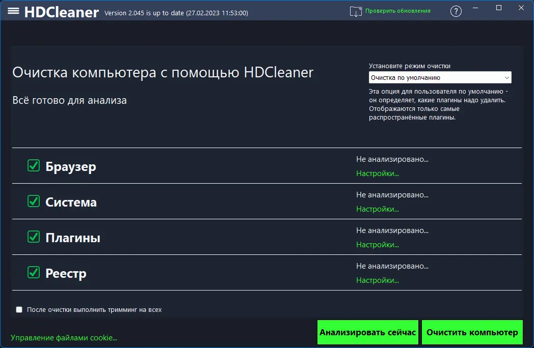 HDCleaner — многофункциональный программный продукт от немецкого разработчика Kurt Zimmermann, предназначенный для эффективной очистки компьютера под управлением ОС Windows. Эта программа создана как бесплатная альтернатива популярному CCleaner и по возможностям может конкурировать с Pro-версиями аналогичных системных утилит. В комплект входят инструменты для очистки жесткого диска, реестра, удаления временных файлов и следов использования, шифрования данных, разделения файлов, создания резервных копий и дефрагментации. Специально оптимизирован для работы с SSD и HDD, что обеспечивает быструю и надежную работу системы.