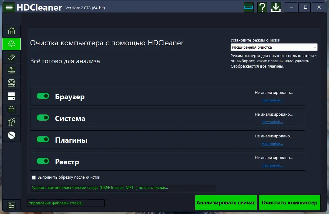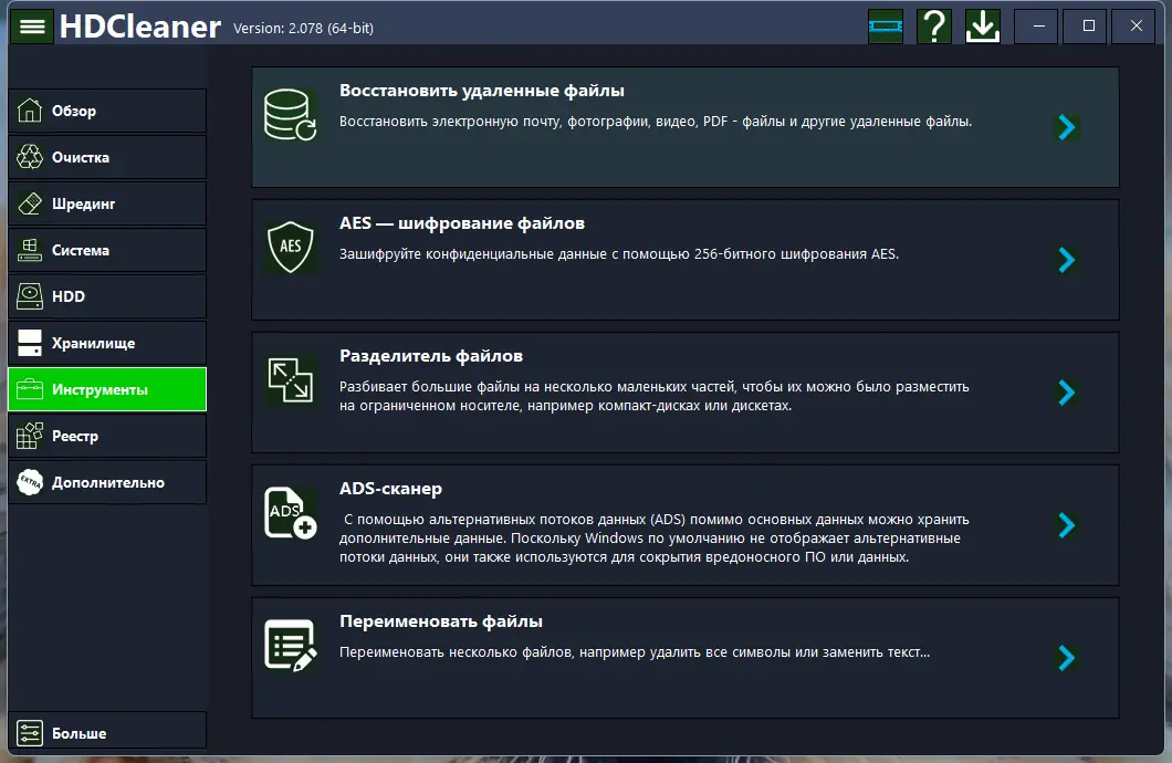 HDCleaner – многофункциональный программный продукт от немецкого разработчика Kurt Zimmermann, предназначенный для комплексной очистки и оптимизации компьютеров под управлением ОС Windows. Он создавался как бесплатная альтернатива популярному CCleaner и по возможностям способен конкурировать с Pro-версиями этого софта. Инструменты HDCleaner позволяют очищать жесткий диск, реестр, удалять следы использования, шифровать данные и выполнять множество других задач, направленных на ускорение работы ПК и повышение его безопасности. Программа оптимизирована для работы с SSD и HDD, обеспечивает безопасное удаление файлов и глубокое очищение системы.