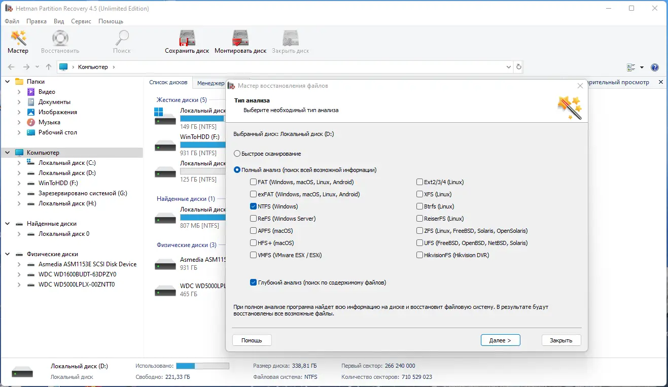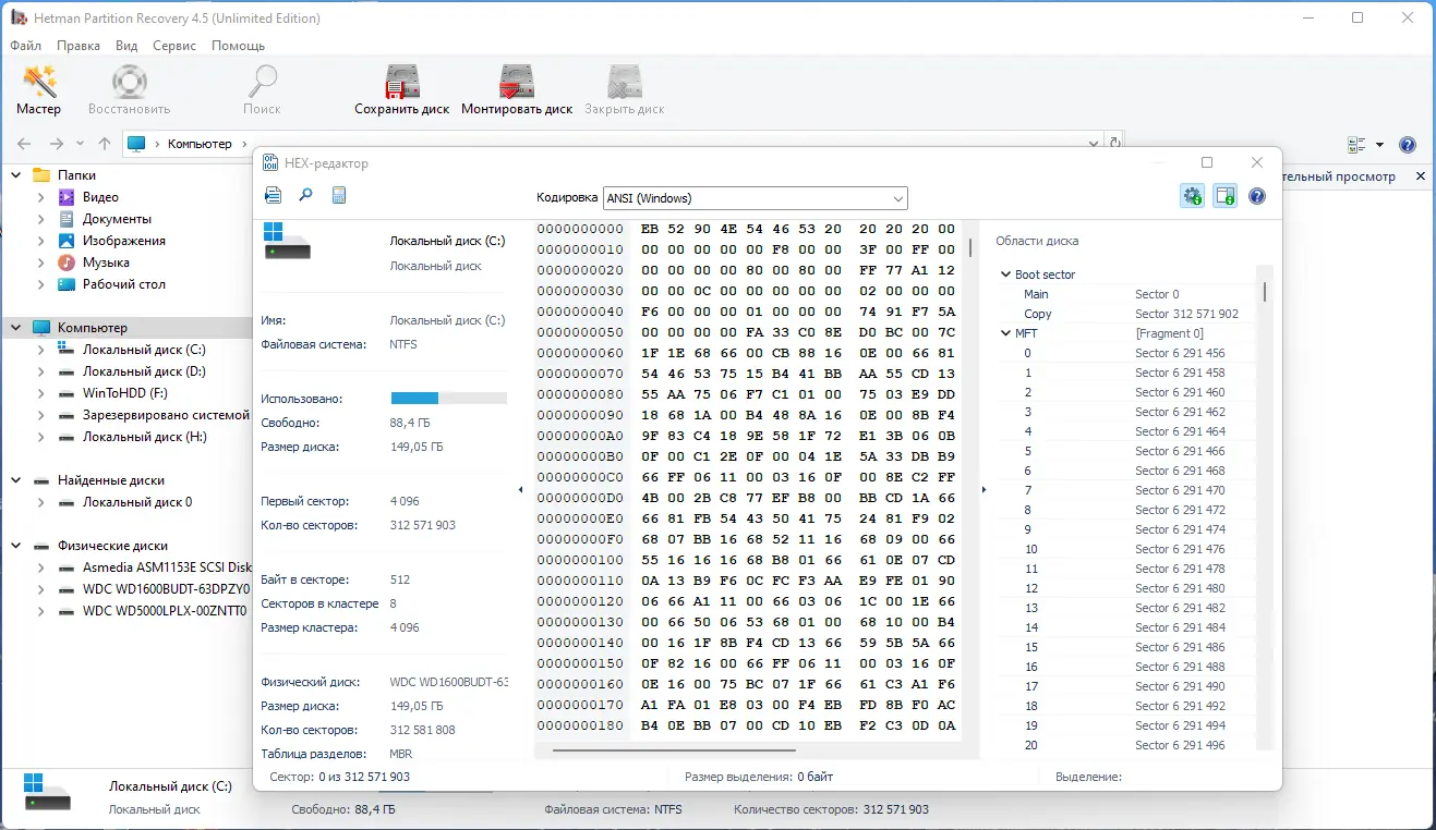 Hetman Partition Recovery — мощная утилита, которая восстанавливает поврежденные или удаленные разделы, файлы и структуру данных с носителей информации, поддерживая широкий спектр файловых систем, таких как FAT, NTFS, APFS, HFS+, Ext2/3/4, ReiserFS, Btrfs, VMFS, Hikvision и XFS. Объединяя несколько алгоритмов, программа находит и возвращает имена файлов, их атрибуты, содержимое и оригинальную структуру каталогов. Кроме того, она может обнаруживать все ранее созданные разделы диска и отправлять их для дальнейшего анализа и поиска удаленной информации. Удобный интерфейс, встроенный мастер и rushelp делают работу с программой интуитивно понятной даже начинающим пользователям.