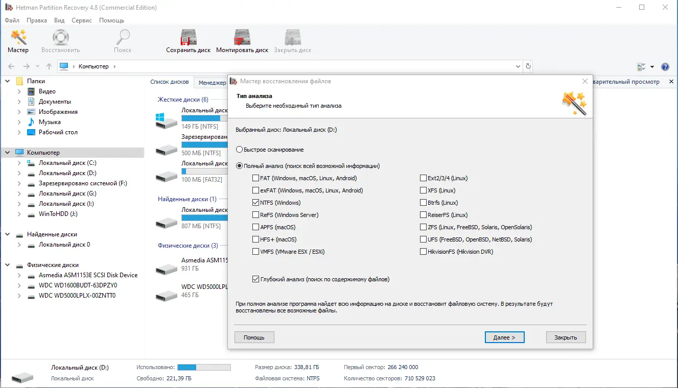 Hetman Partition Recovery – это эффективная и простая в использовании утилита, которая позволяет восстанавливать утерянные или поврежденные данные с жестких дисков, USB-накопителей, карт памяти и виртуальных дисков. Она поддерживает все популярные файловые системы FAT / exFAT, NTFS / ReFS, APFS / HFS+, Ext2 / 3 / 4 / ReiserFS, Btrfs, VMFS, Hikvision и XFS / UFS / ZFS. Программа автоматически исправляет ошибки логической структуры диска, выявляет скрытые разделы и выводит их для дальнейшего анализа. Встроенные алгоритмы обеспечивают высокую скорость восстановления и точность, что позволяет вернуть данные быстрее, чем вы досчитаете до трех.